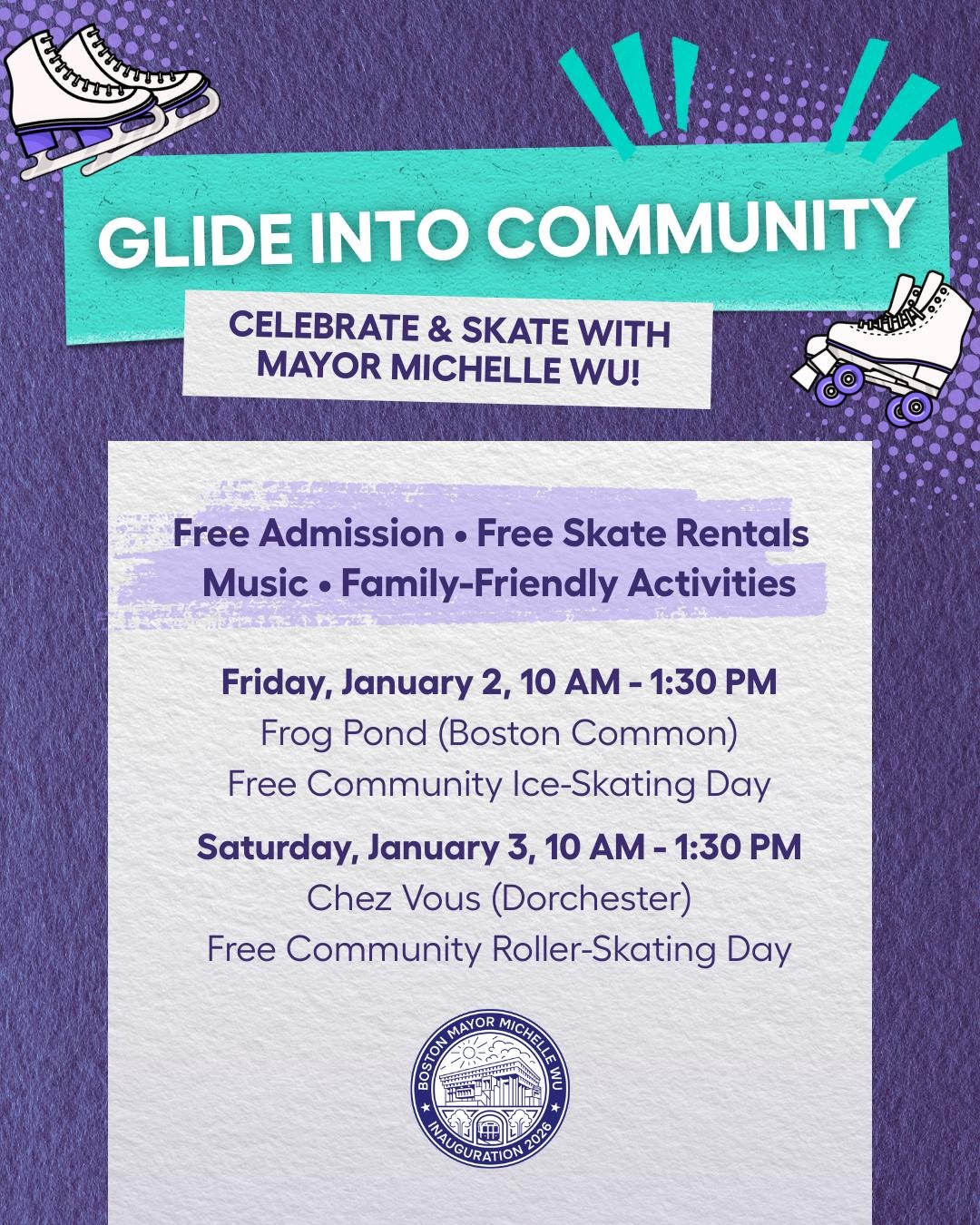 Kick off Mayor Wu’s Inauguration Week with a joyful winter tradition at one of Boston’s most iconic gathering places—Frog Pond. Glide Into Community: Joy on Ice invites families, kids, and neighbors to come together for a free hour of ice skating at the Frog Pond on Boston Common. This community
